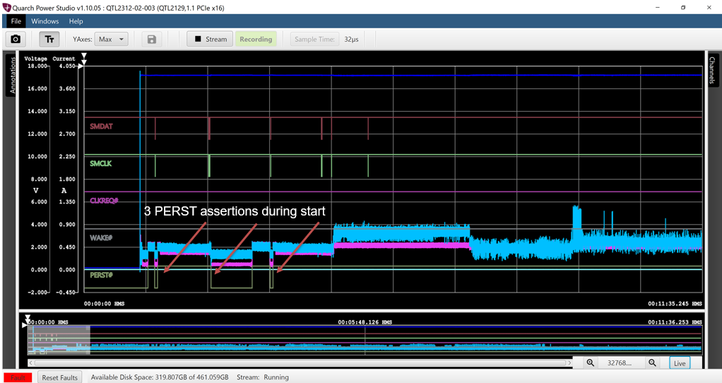 Quarch Power Studio showing power up trace with multiple PERST assertions