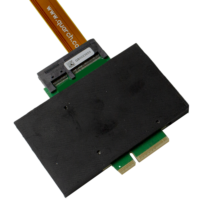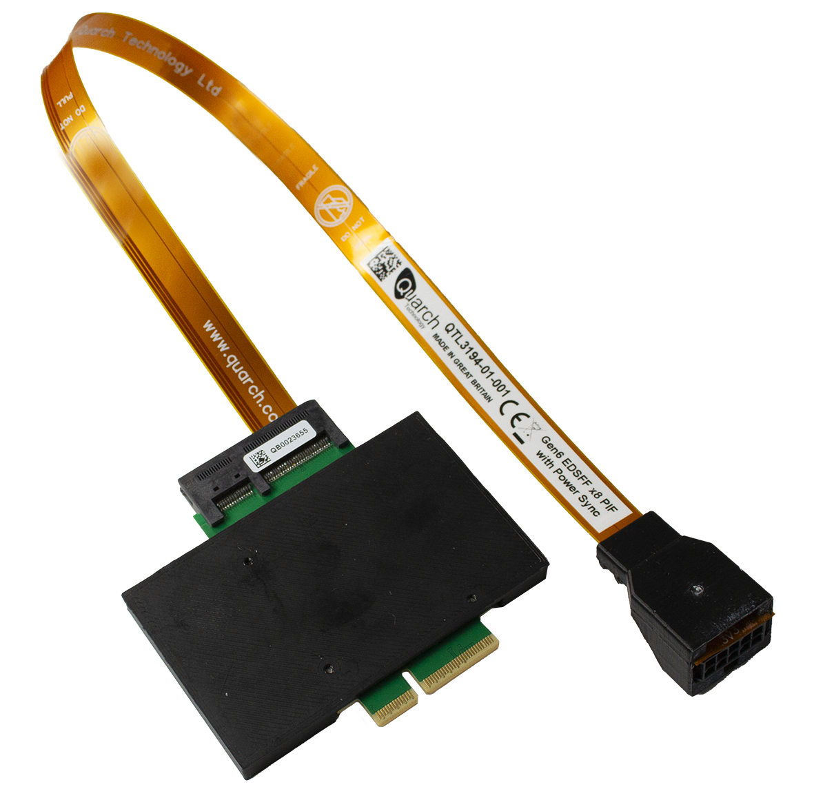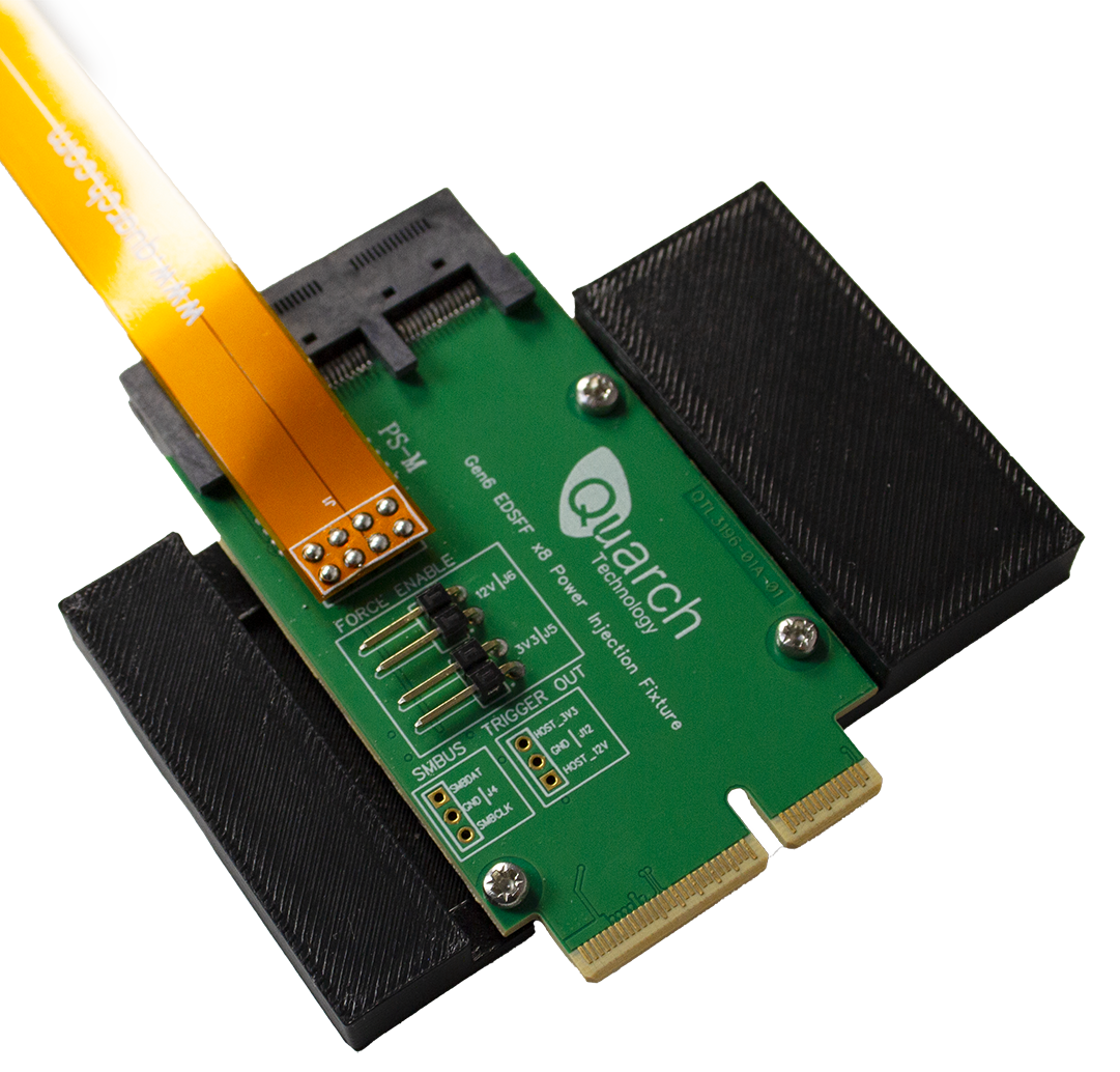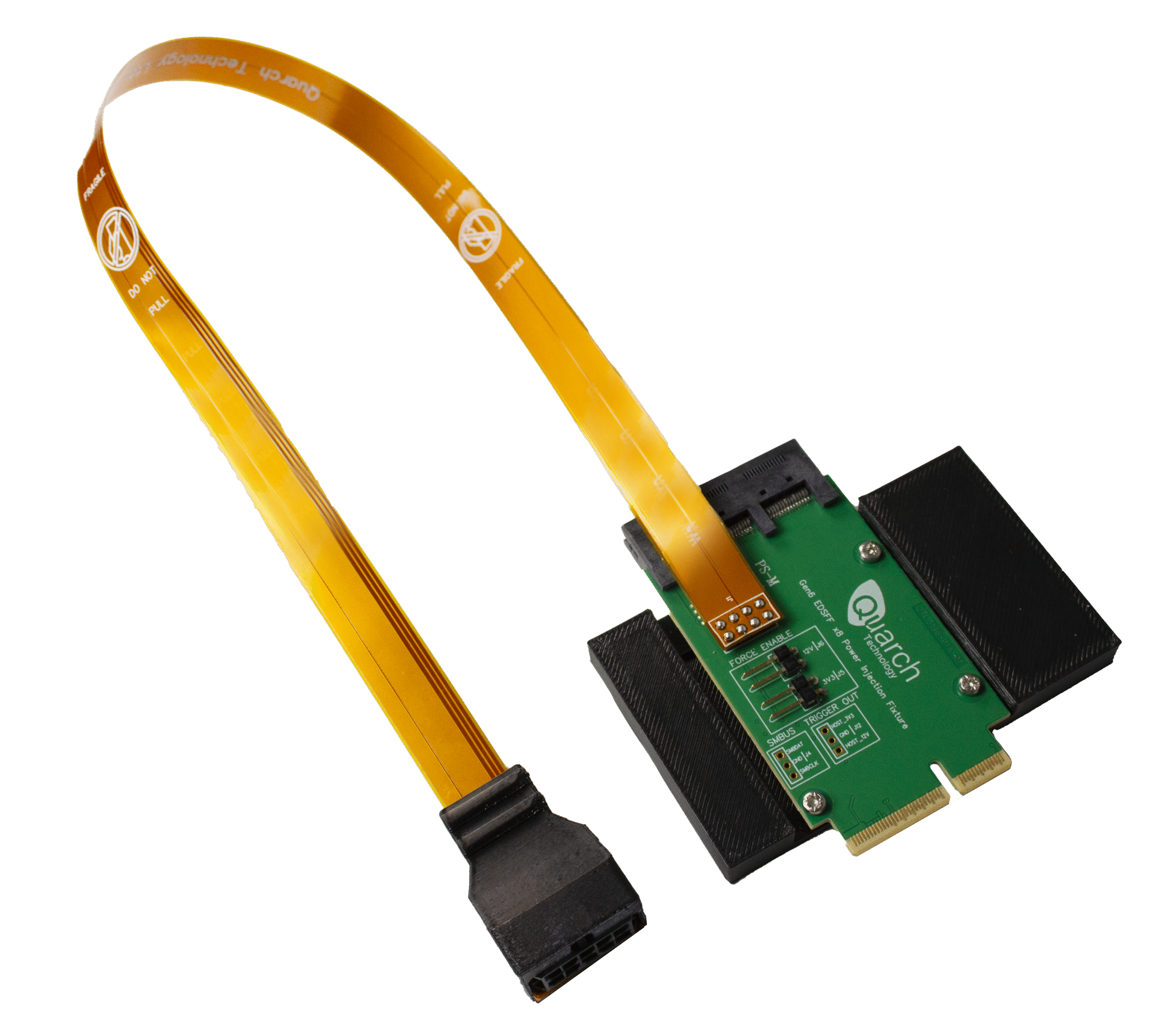 This unit is intended for use in testing EDSFF systems by replacing the host power to the device with power “injected” by a Quarch Programmable Power Module – allowing programmable voltages and accurate current measurement. The Gen6 EDSFF interface is an x8 edge connector to the host and an x8 straddle mount connector on the opposite edge for the device. An PPM HD connector is used to inject power and interface with PPM.